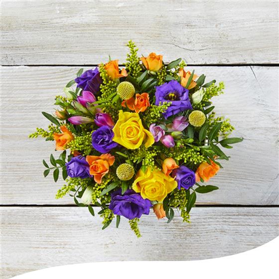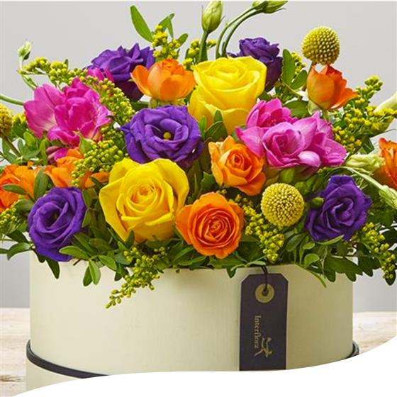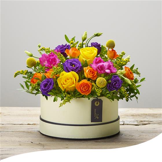 Brighten up your space or surprise a friend with our Candy Pop Hatbox arrangement! Filled with vibrant colours to celebrate summer, this arrangement features yellow Roses, orange Spray Roses, purple Lisianthus, Solidago, pink Freesias, and a mix of lush greenery. Delivered in water in an elegant hatbox, it’s the perfect way to add a pop of colour and joy to any setting.