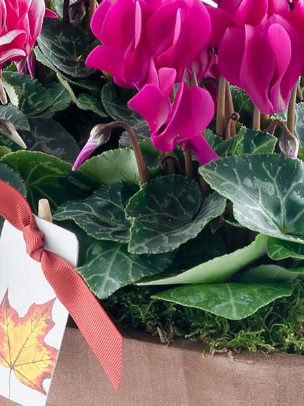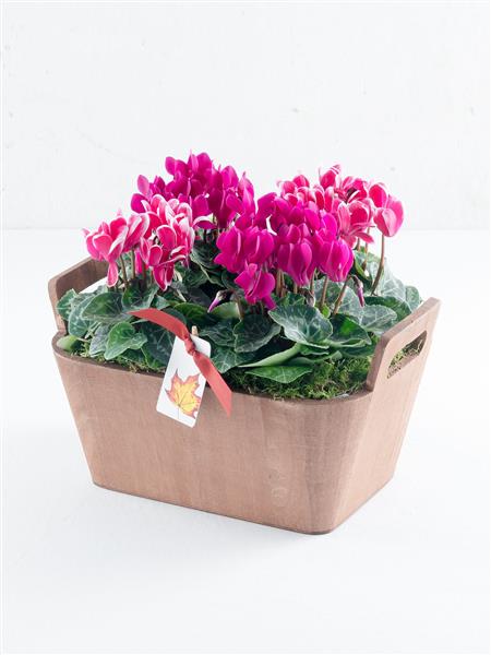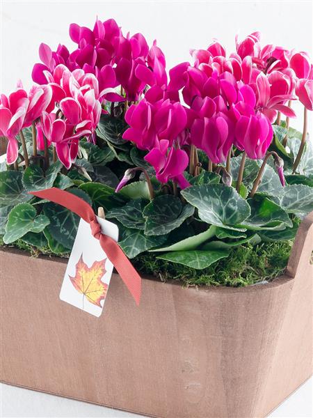 Featuring cerise cyclamens and variegated pink cyclamens planted in a wooden trug, trimmed with a ribbon and gift tag.