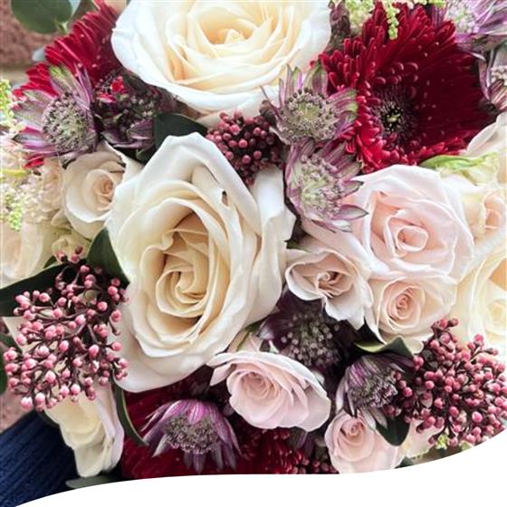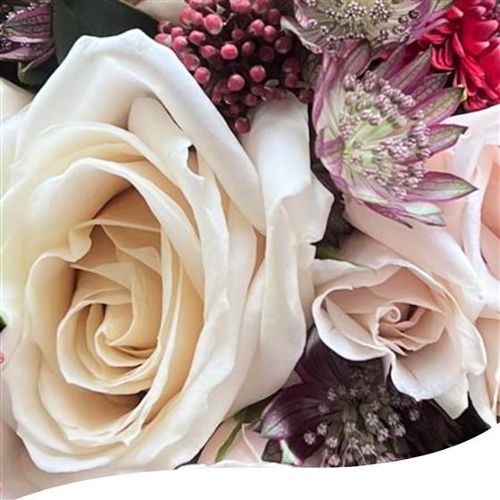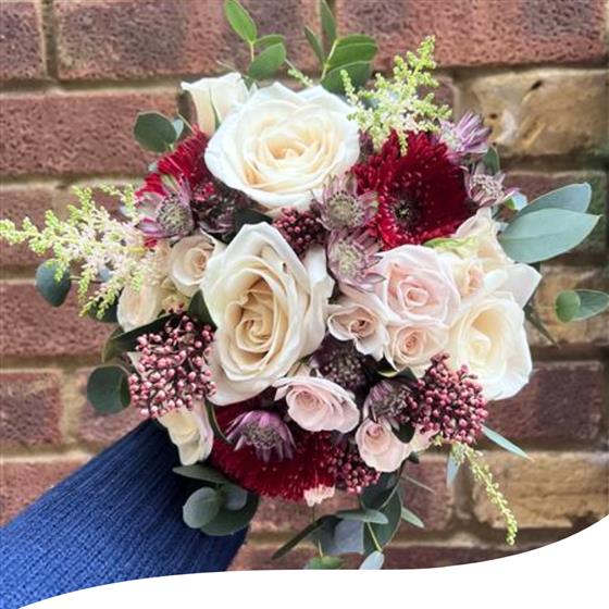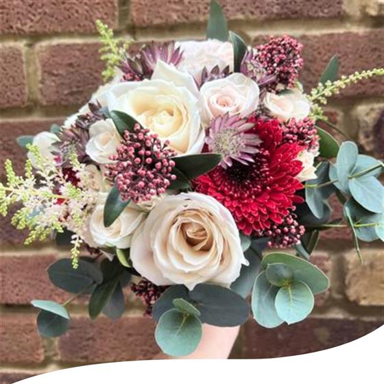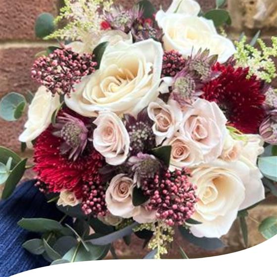 Flowers included: Dusky pale Astilbe, burgundy Astrantia, Vendela Roses, ivory Spray Roses, burgundy PomPom Mini Gerberas, and Skimmia berries, all beautifully accented with Eucalyptus.