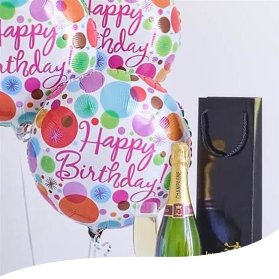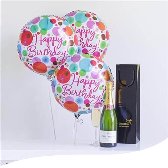 Featuring 3 Happy Birthday helium balloons and a bottle of Louis Rozier champagne presented in an gift bag.
