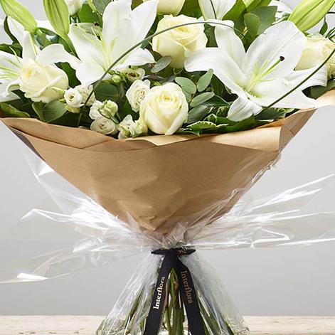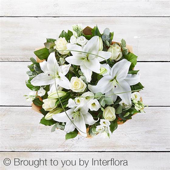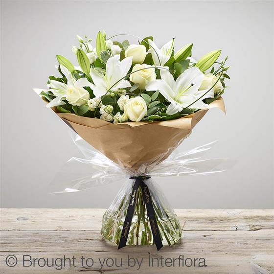 Featuring ivory large headed roses, white Oriental lilies and white lisianthus handtied with steel grass, salal, eucalyptus and pittosporum and presented in Gift Packaging.