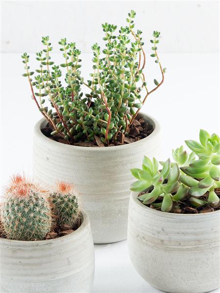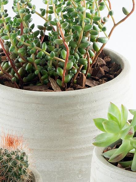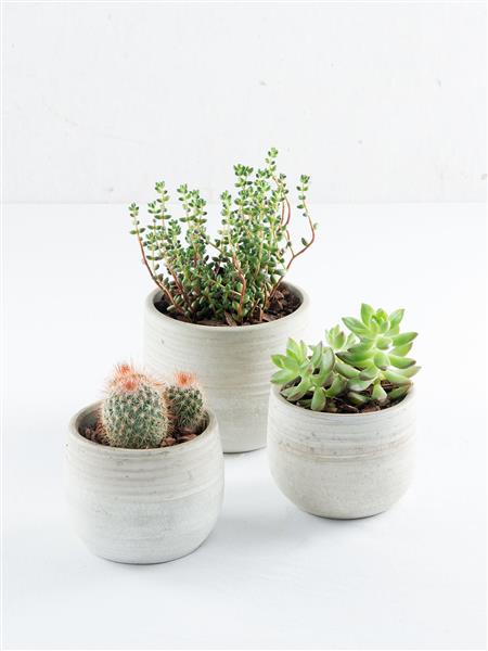 Featuring a crassula, an echiveria and a cacti in stone pots. These 3 plants are very low maintenance.