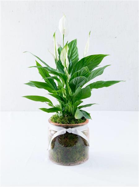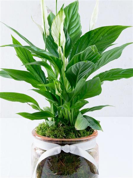 Featuring a peace lily planted in a glass jar and trimmed with ribbon. This plant is recommended due to its great ability to improve air quality.