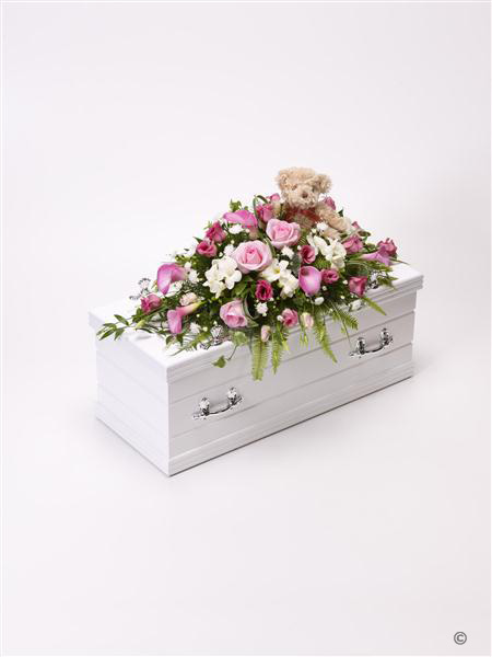 Bramble Bear sits amongst a sea of pink and white flowers, creating a fitting tribute for a little girl. Roses and calla Lily in soft pink shades are arranged with white freesia, September flowers and deep pink lisianthus and finished with China grass, ruscus, ferns and ivy trails.