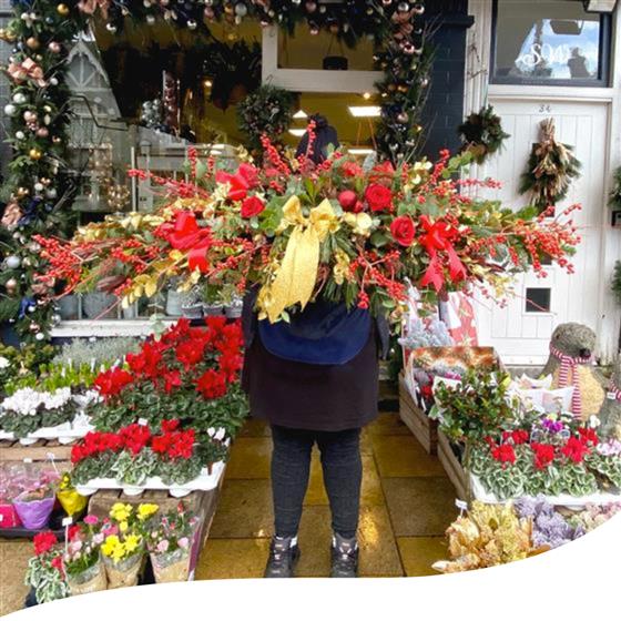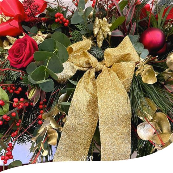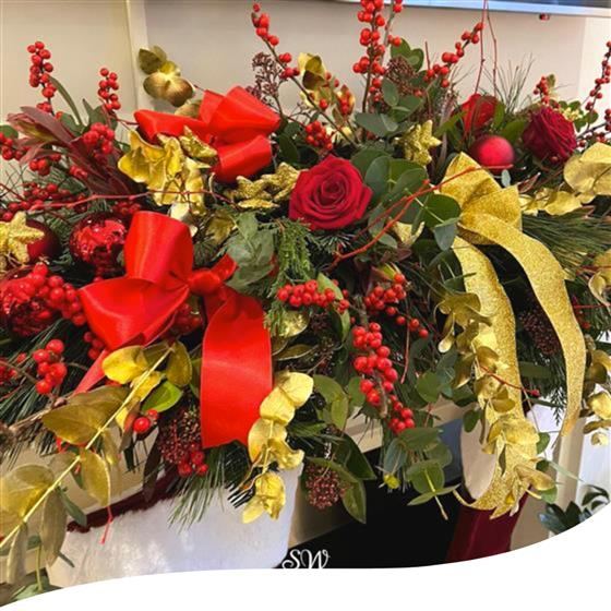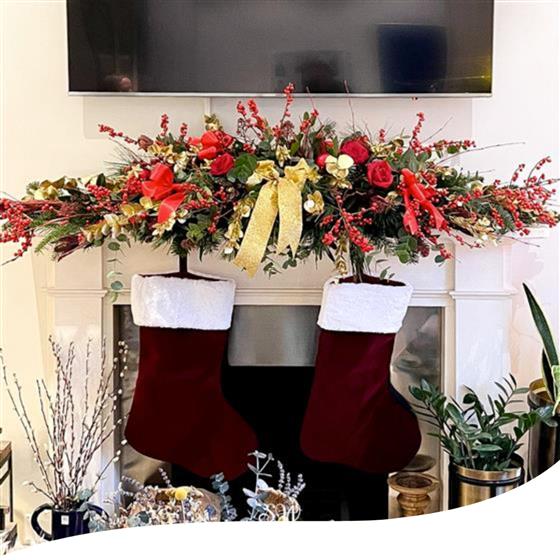 Introducing our Front-Facing Fireplace Christmas Arrangement, a captivating centrepiece designed to elevate your festive décor. Adorned with vibrant red flowers and glistening golden accessories, this exquisite creation adds warmth and elegance to your holiday setting.