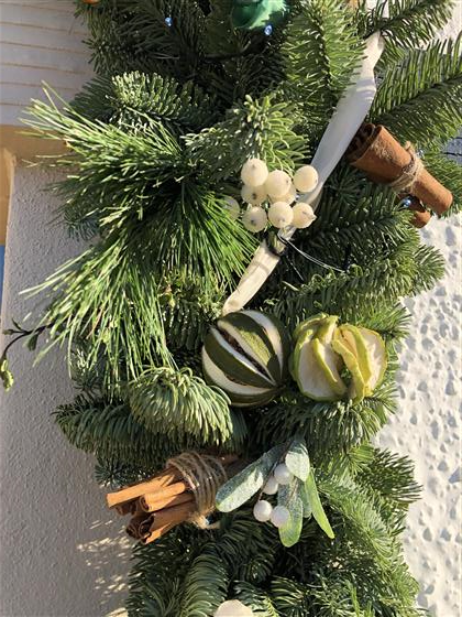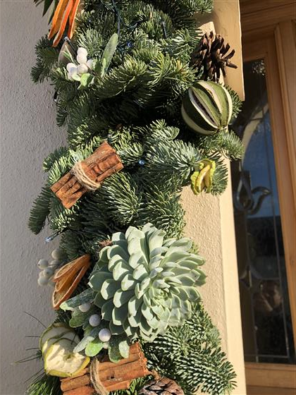 A full Luxury Christmas Garland with all the seasonal pines, Greens and Berries. Mixed Spruces, Pines and Winter foliage make this our recommended garland for Christmas. Fully decorated with natural pine cones, Seed Pods, Oranges, Dried Fruits, Cinnamon Twigs, Organza or ribbon Bows. 1M long. Extra Add on Succulents finish these masterpieces.