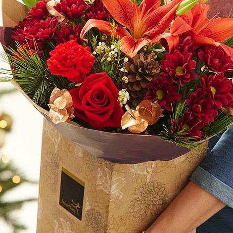 An expertly hand-crafted bouquet delivered perfectly pre-arranged. Jolly festive tones for a truly Christmassy feel.