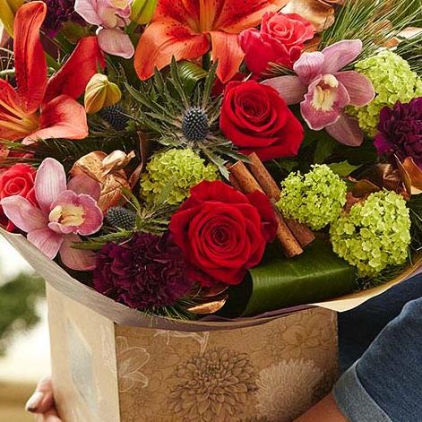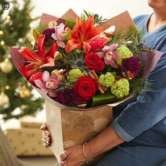 An expertly hand-crafted bouquet delivered perfectly pre-arranged. Jolly festive tones for a truly Christmassy feel.