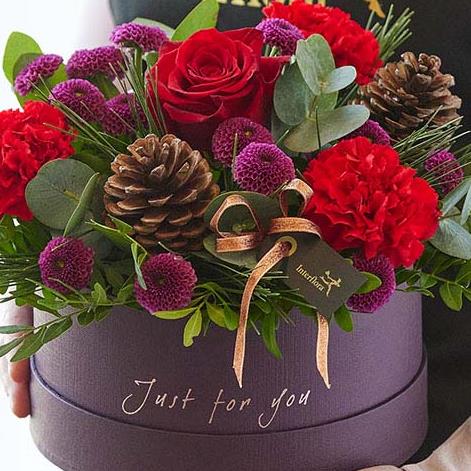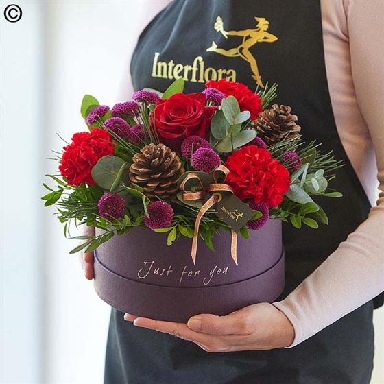 An easy-to-care for arrangement of flowers in a pretty hatbox. Jolly festive tones for a truly Christmassy feel.