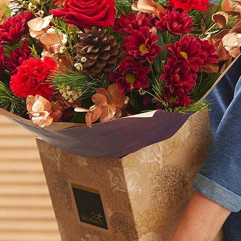 An expertly hand-crafted bouquet delivered perfectly pre-arranged. Jolly festive tones for a truly Christmassy feel.
