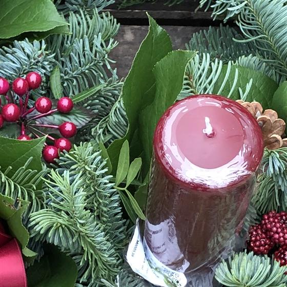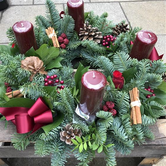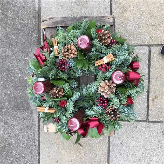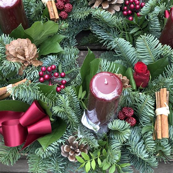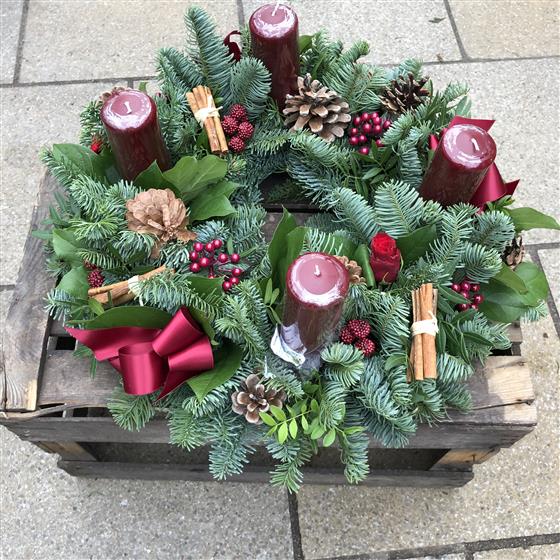 This beautiful advent wreath has Ribbon bows, Cinnamon Sticks, Pine Cones, 4 x candles and a mix of beautiful pine.