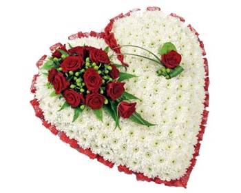 A classic heart-shaped design covered with a mass of white double spray chysanthemums and finished with a spray of red large-headed roses, and ruscus.