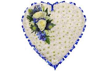 A Funeral Heart in White and Blue shades. With a Bright Blue Ribbon edge, White Akito Roses, White freesia, Blue Delphiniums and some Blue Eryngium thistles.