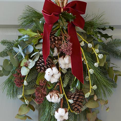 Imagine a Christmas wreath but straighter, or a bouquet but flatter – that's a swag. Designed to hang on a door, this exquisite decoration will be made using the freshest festive blooms.