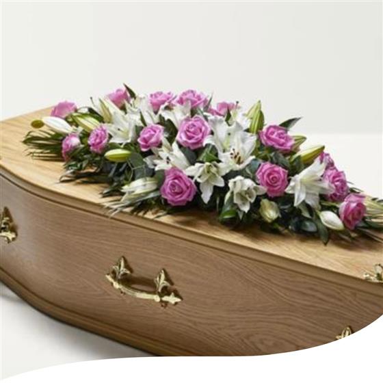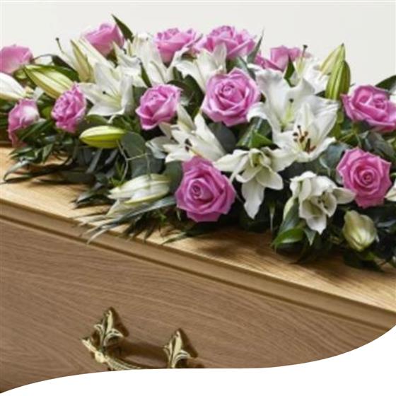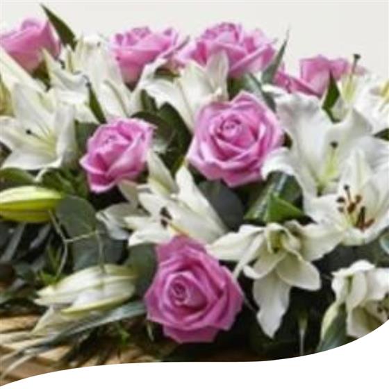 This stunning spray brings together the timeless combination of lilies and roses. It’s a substantial tribute framed with foliage of eucalyptus and palm.