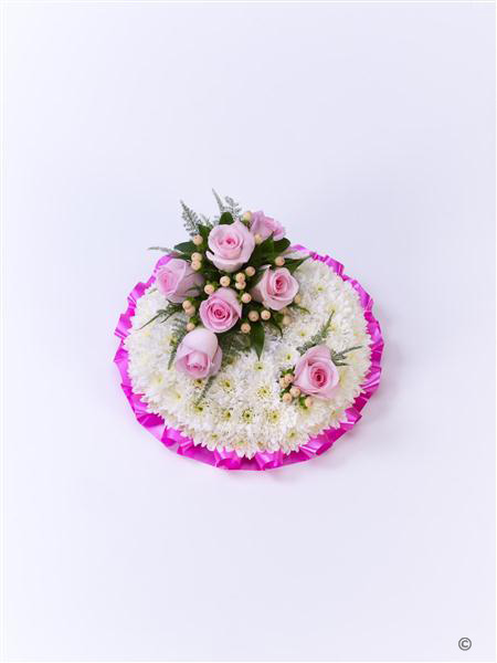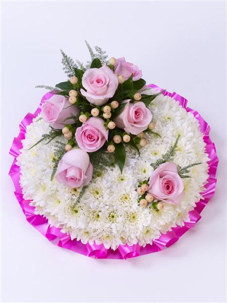 A classic posy design created using a mass of white double spray chrysanthemums and completed with a spray of pink roses, French ruscus and hypericum berries.