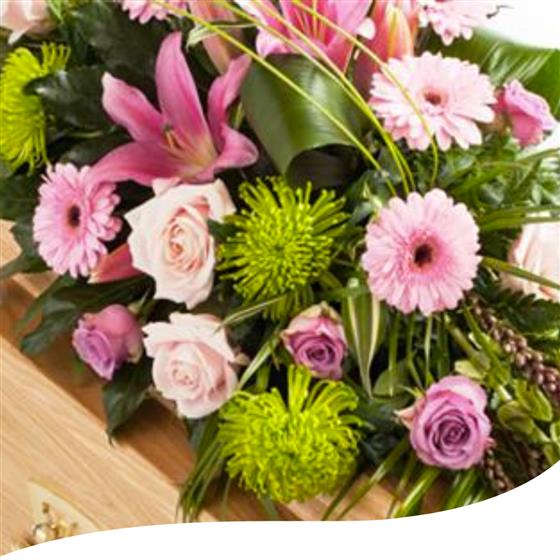 Delicate shades of pink, lilac and lime green feature in this very pretty floral spray. Oriental lilies are the centrepiece and a selection of chrysanthemums, gerbera, liatris, aspidistra and molucella give plenty of texture and interest. This traditional design is available in a choice of three sizes.