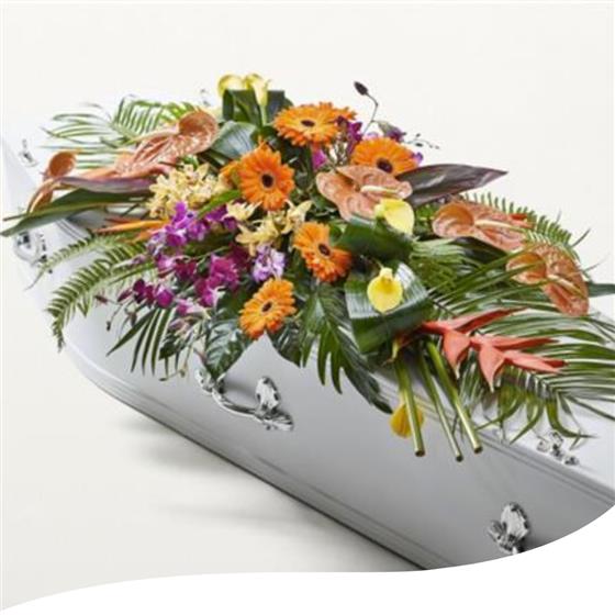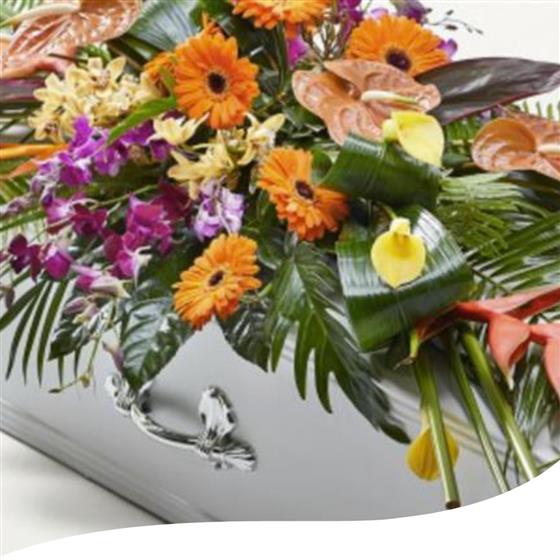 A beautifully arranged spray featuring layers of warm shades and delicate textures thanks to the natural combination of anthuriums, orchids, calla lily and heliconia.