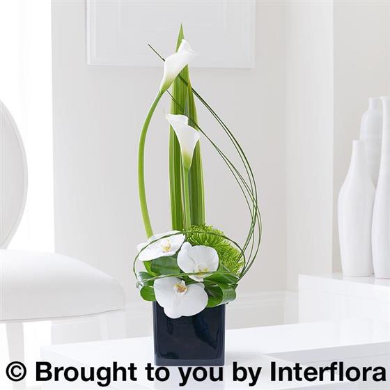 Featuring 2 white calla lilies, 3 green chrysanthemum blooms and 3 white Phalaenopsis orchid heads with aspidistra and phormium leaves and flexigrass, presented in a black cube container.