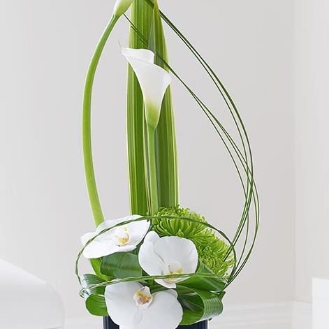 Three pristine Phalaenopsis orchid flowers are set against the contrasting form of lime green chrysanthemum blooms. From here, the eye sweeps round and up towards two perfect calla lilies, their green stems culminating in the purest white bell-shaped petals. Exquisite.