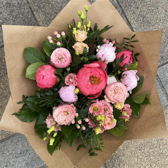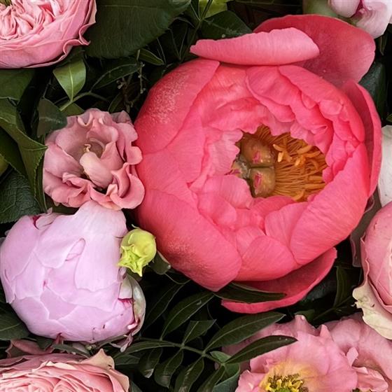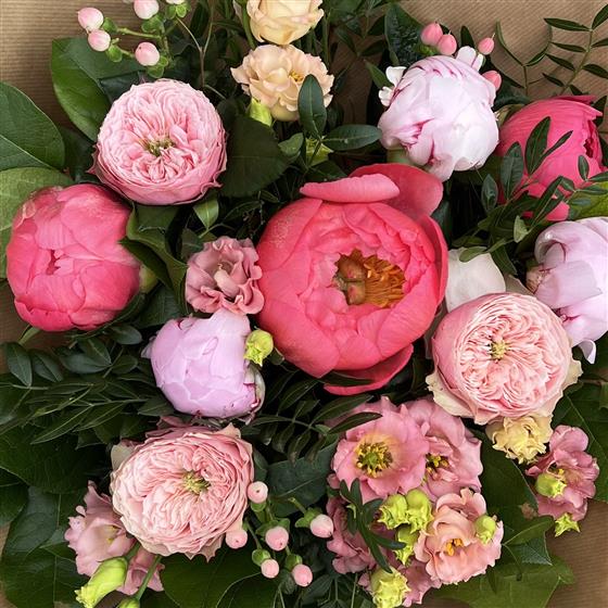 A beautiful mixture of stunning Pink Garden Northanger Abbey Roses, Coral Peonies, Sarah Bernhardt Peonies, Pink Lisianthus and Pink Hypericum creating a beautiful summery mix!