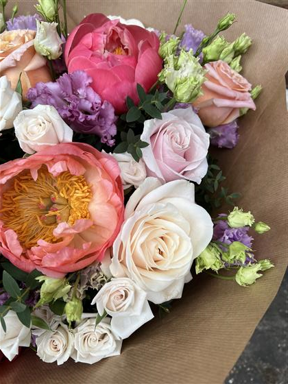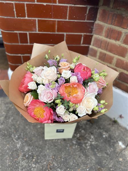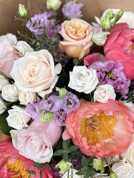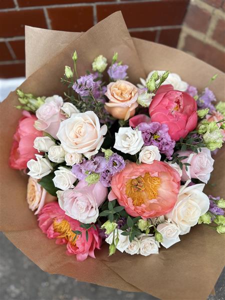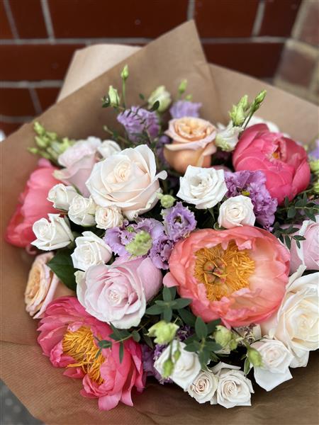 Coral Sunset Peony Bouquet, made with the most beautiful summer flowers.