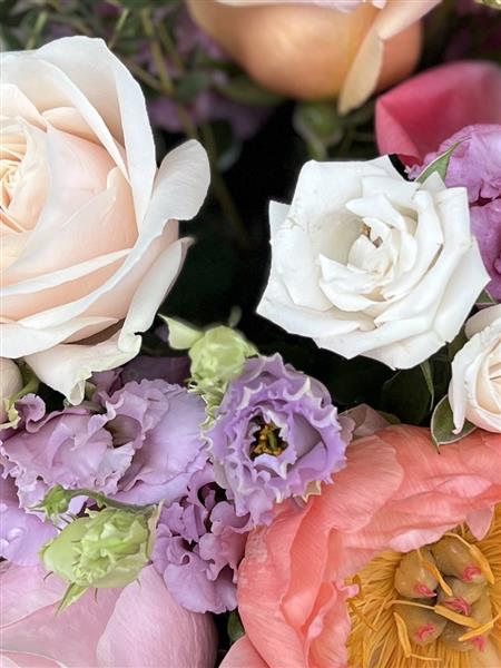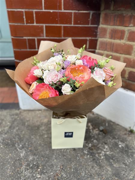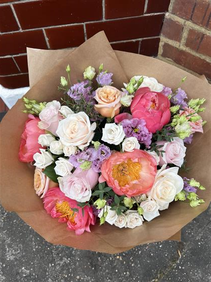 Using a selection of stunning Coral Peony and a mix of Roses. Shimmer Roses, Dorchester roses, Porcelina Spray Roses and Grape Lisianthus.