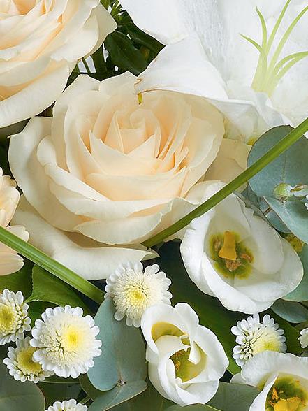 Featuring 2 cream large-headed roses, 2 peach germinis, 1 white Oriental lily, white spray chrysanthemums and white lisianthus with steel grass, eucalyptus and salal carefully arranged in a cream ceramic container.