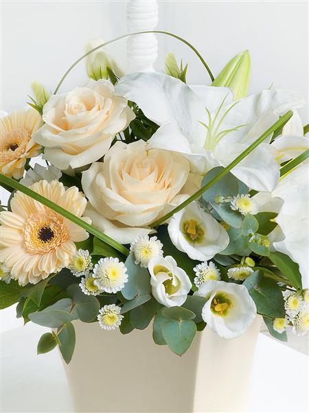 Featuring 2 cream large-headed roses, 2 peach germinis, 1 white Oriental lily, white spray chrysanthemums and white lisianthus with steel grass, eucalyptus and salal carefully arranged in a cream ceramic container.