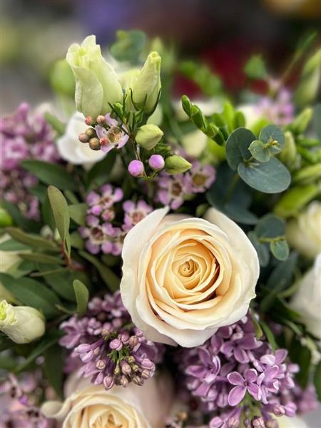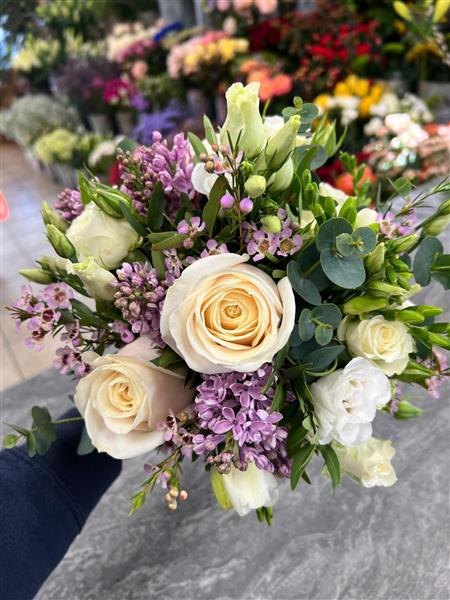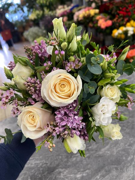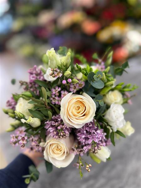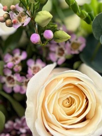 Bridal bouquet made with Dorchester roses, White Freesias, White Alissa Lisianthus and beautiful pale pink wax flowers. Hand tied into a beautiful design using the most elegant blooms.