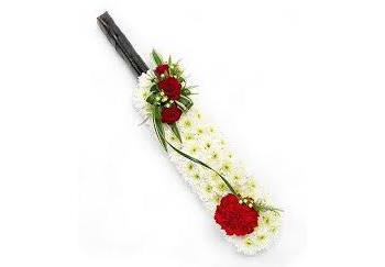 A cricket bat and ball shaped tribute based with white spray Chrysanthemums finished with a selection of flowers and foliage in your choice of colour.
