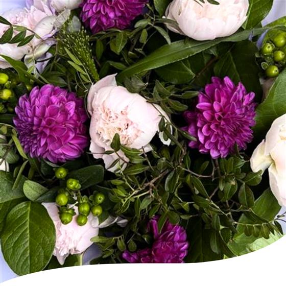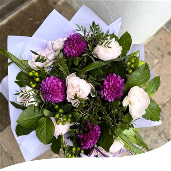 Introducing our enchanting mixed Dahlia and Peony Bouquet, embellished with Hypericum Berries and choice foliage for a captivating blend of textures and colours. Each bouquet is carefully hand-tied and aqua-packed to ensure freshness upon arrival, and elegantly wrapped in our delightful gift packaging.