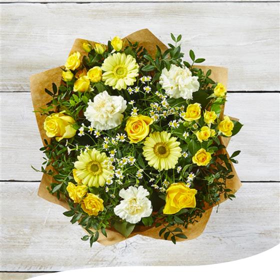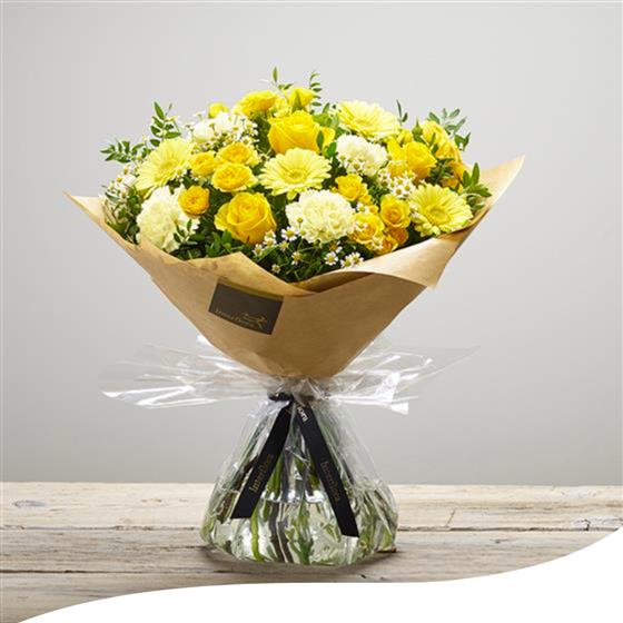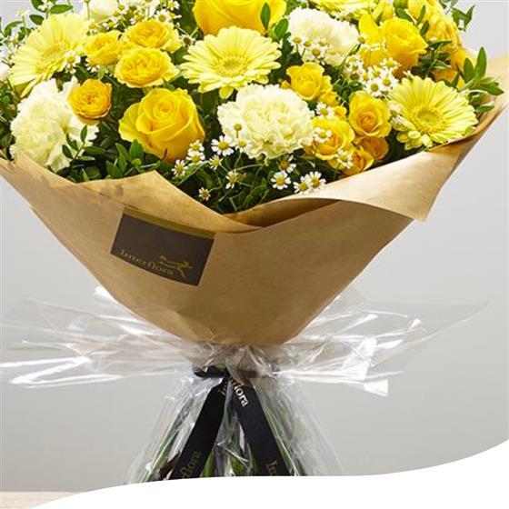 Vibrant Blooms: Includes a harmonious yellow mix of Carnations, Gerberas, Roses, Spray Roses and delicate Daisies.