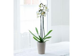 A stunning twin stemmed large white Phalaenopsis orchid plant which has the option to be presented in a contemporary ceramic pot.