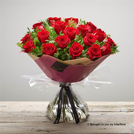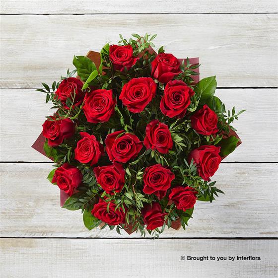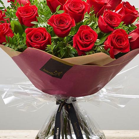 Featuring red large headed roses with pistache and salal, hand-tied, wrapped and presented in gift packaging