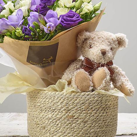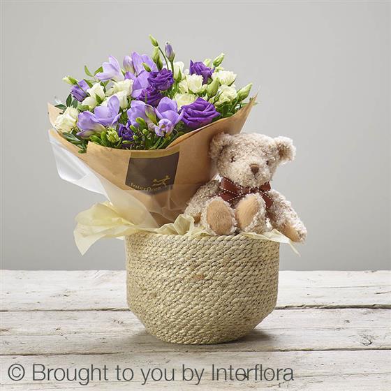 Featuring purple freesia, purple lisianthus, white spray roses and pistache, beautifully arranged in a soft woven jute basket, paired with a cute cuddly toy.