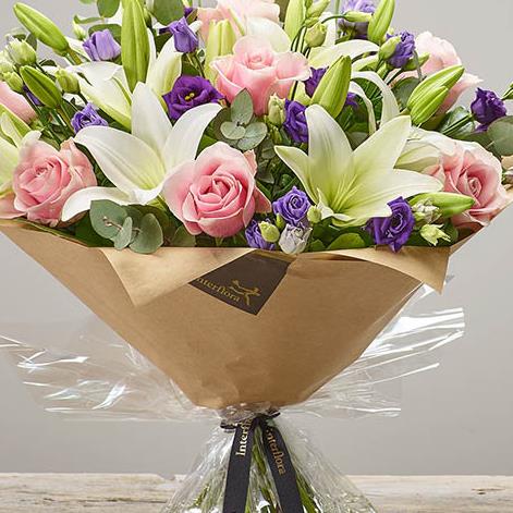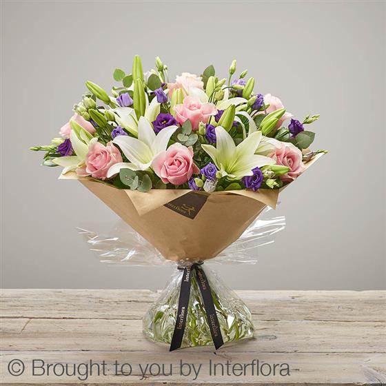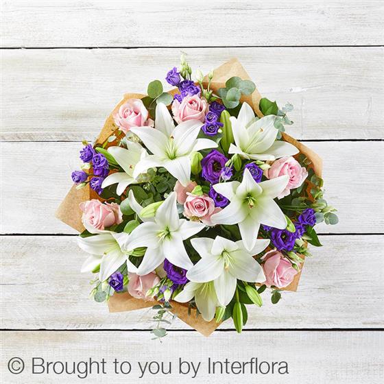 Featuring pink large headed roses, white LA lilies and purple lisianthus, hand-tied with eucalyptus and salal, and presented in Gift Packaging.