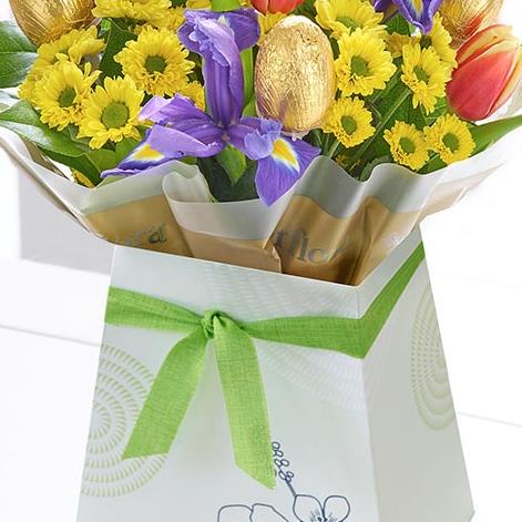 Featuring yellow spray chrysanthemums, red/yellow tulips and blue iris with salal, presented with foil-covered chocolate Easter eggs in a floral design gift box