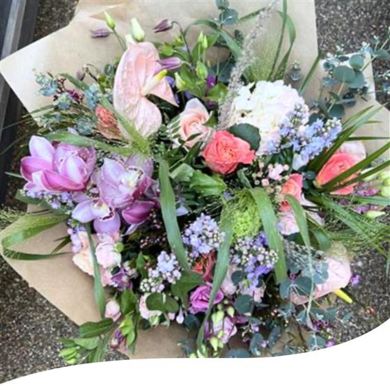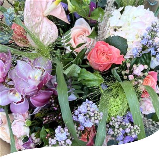 This hand-tied bouquet features Miss Piggy Roses, Pear Avalanche Roses, Lilac Syringas, Pink Pastel Hydrangeas, Cymbidium Orchids, Pink Spray Roses, Pink Bouvardias, Pink Anthuriums, Limonium Statices, Clematis, Mondial Pink Roses and Eucalyptus. Whether surprising a loved one or treating yourself, our Elegant Beauty Bouquet is sure to delight!