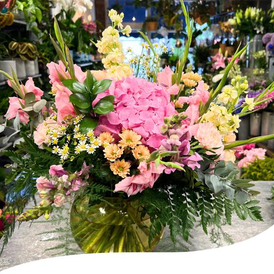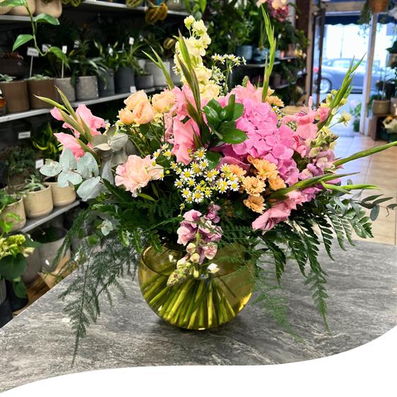 Behold the stunning Elegant Garden Vase Arrangement, featuring a vibrant mix of garden flowers carefully selected for their beauty and freshness. The arrangement includes Hydrangeas, Snapdragons, Chrysanthemums, Roses, Daisies, and lush green foliage, all nestled in a sleek, clear globe vase. Our dedicated team ensures exceptional customer service from order to delivery.