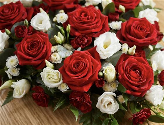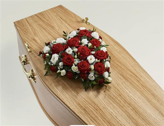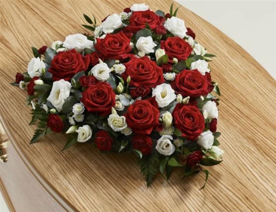 An elegant heart shape formed with a neatly arranged selection of roses, lisianthus and carnations finished with foliage of eucalyptus and leather leaf.