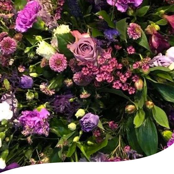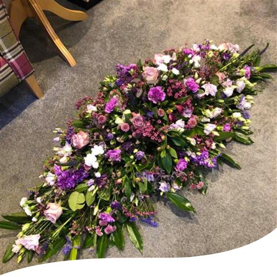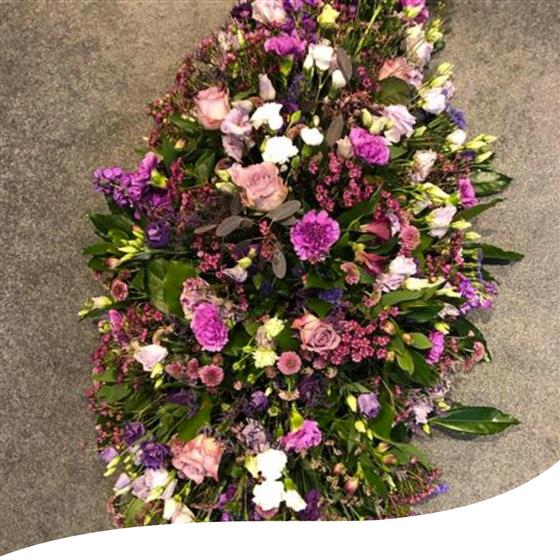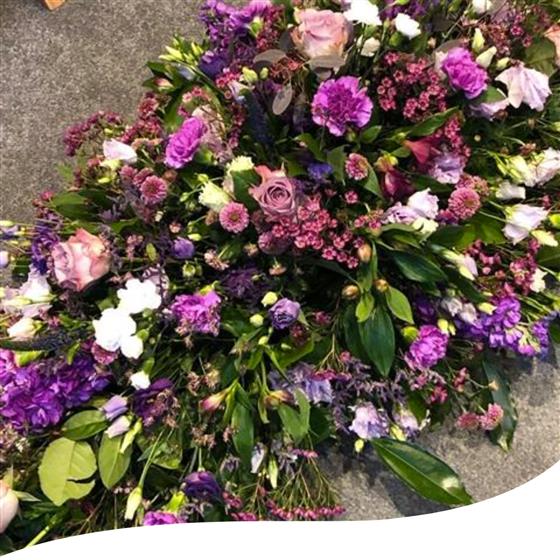 This beautiful coffin spray is made of purple Waxflower, lilac Limonium statice, Lilac Roses, Moon light carnations, Purple Alstro, lilac Lisianthus, purple Lisianthus, lilac Doria Santini, Lilac stocks with a mixed selection of foliage.