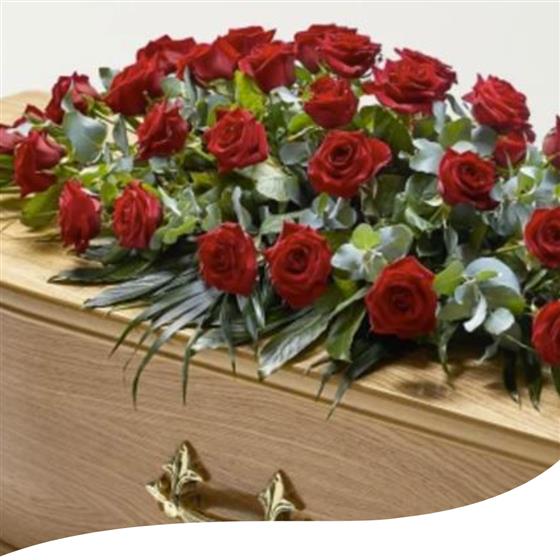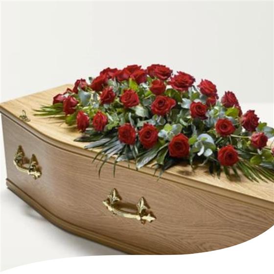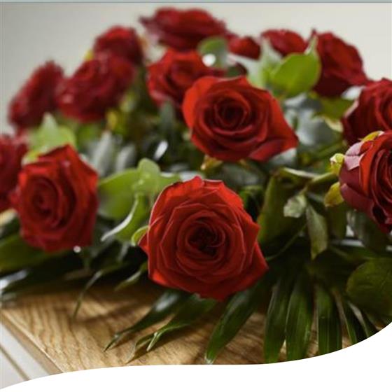 A striking yet beautifully simple display with an abundance of roses framed by palm, fatsia leaf and eucalyptus.