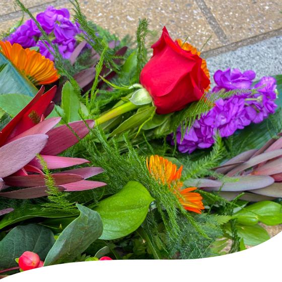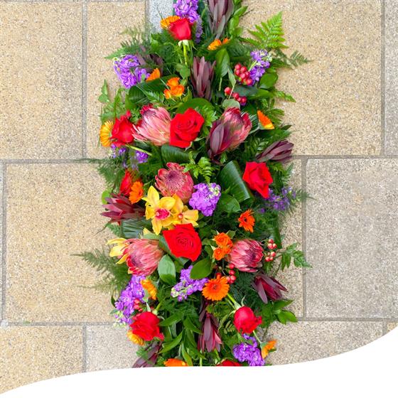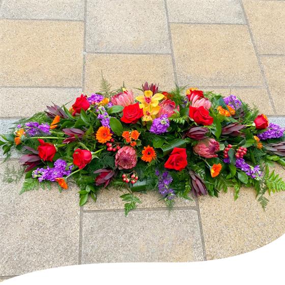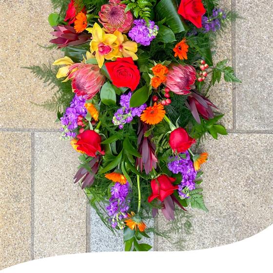 Embrace the serene beauty of our Casket spray, crafted with a fragrant blend of vibrant tropical blooms.