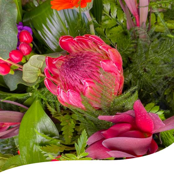 Featuring elegant Protea, Stocks, Germini, Orchids and other summer flowers, this stunning arrangement pays a heartfelt tribute with its rich colours and delicate fragrance.