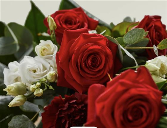 Carefully constructed, this simple yet beautiful sheaf of roses is formed with Lisianthus and carnations and is hand finished with a ribbon bow.