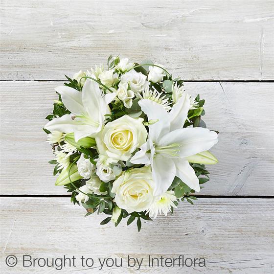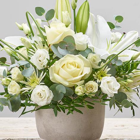 Featuring a white oriental lily, white spray chrysanthemum, white lisianthus, white large headed roses and a white spray rose with eucalyptus, pistache and steel grass, arranged in a stylish grey concrete pot.