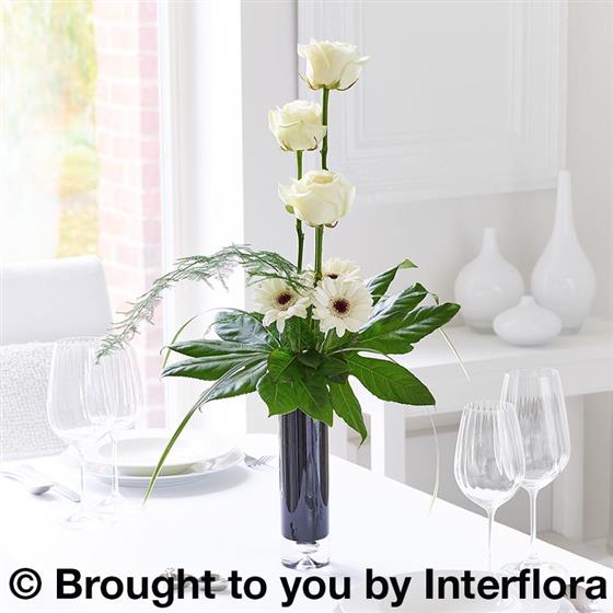 Featuring 3 white germini and 3 white large headed roses with aralia leaves, trailing asparagus fern and China grass presented in a Jetta tall slim colonnade vase.