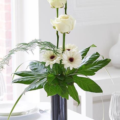 This gorgeous vase arrangement is all about understated elegance. Pristine white long-stemmed roses and simple germini with dark contrasting centres form the perfect partnership. Set against shimmering green leaves and delicate fern, the result is pure class.