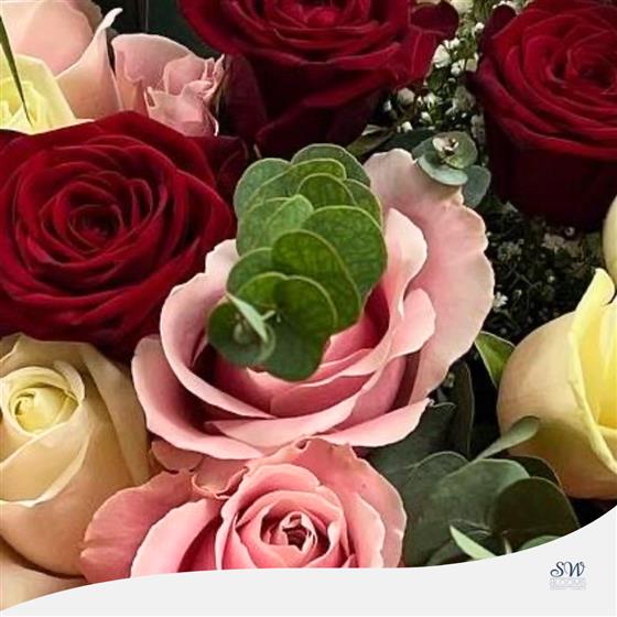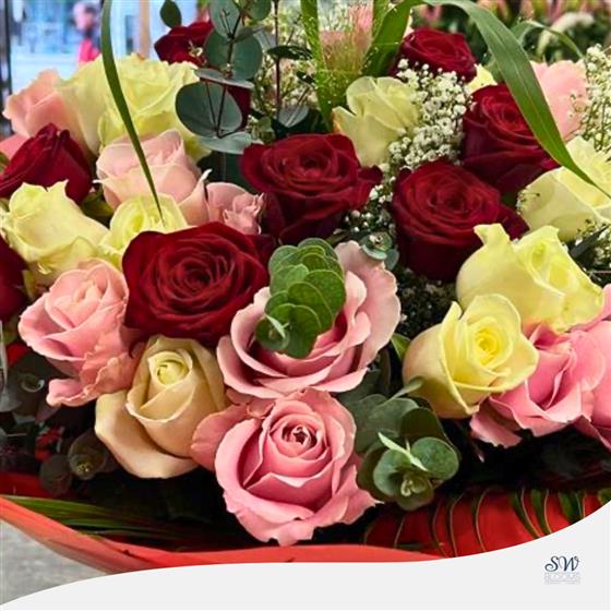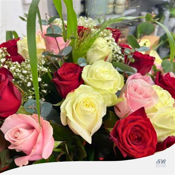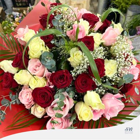 Indulge in the sophistication of our exquisitely arranged bouquet featuring 50 mixed Red, Pink, and White Avalanche and Naomi Roses. Adorned with delicate Gypsophila, fragrant Eucalyptus, graceful Panicum Fountain Grass and elegant Palm Leaves, this bouquet is a harmonious blend of colours and textures.